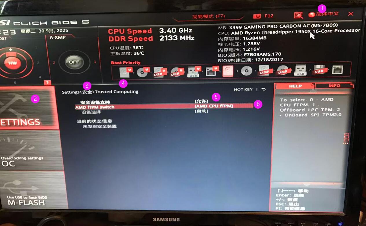 关于反复重启,就是将“AMD fTPM switch”选项更改为“AMD CPU fTPM” 再按下键盘的“F10”保存且会自动重启即可!