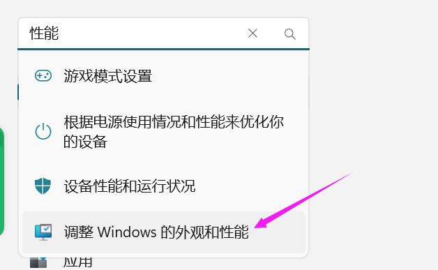 1、点开设置,在搜索框输入性能,点击“调整Windows外观和性能”