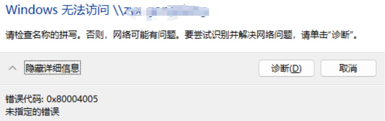 公司菲姐想连接公司打印机,在地址栏里输入\\共享的电脑提示“错误代码0x80004005未指定的错误”,如下图所示