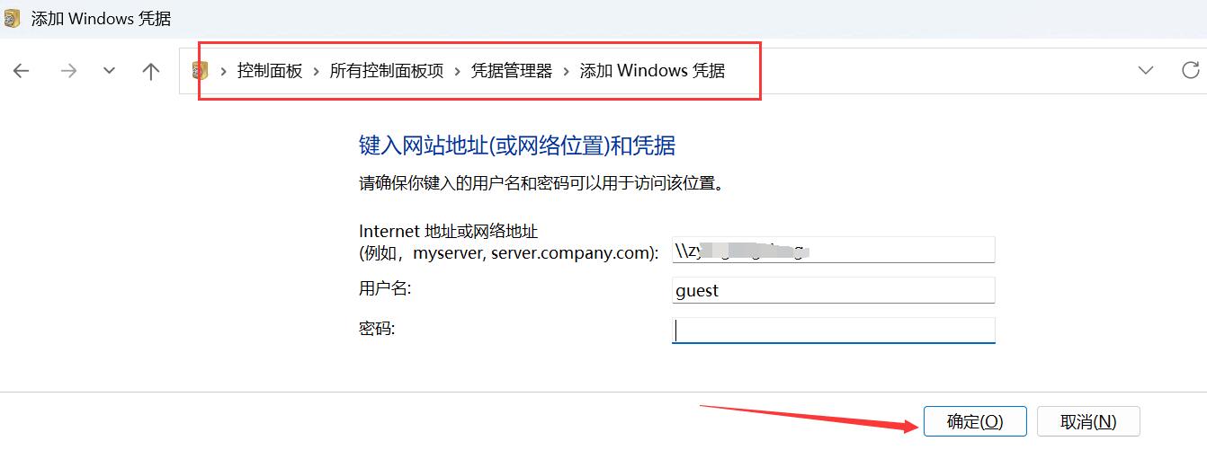 控制面板----所有控制面板项----凭据管理器----添加 Windows 凭据---输入自己共享的账户信息即可,如下图所示
