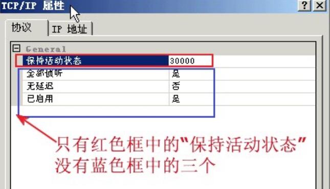 属性的时候,发现在“协议”那一栏,只有“保持活动状态”,其它三个都没有了。而在“IP 地址”栏,缺少IPALL。这个问题的解决办法是去注册表为TCP/IP增加丢失的项。如下图: