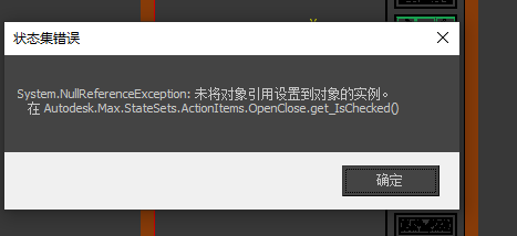 看到“System,NullReferenceExcepton:未将对象引用设置到对象的实例”好像跟SQL报错似的,有点意思,再跟着后面就出现了“在Autodesk,Max,StateSets,ActionItems,Openclose.get Ischecked()”,其实这个错误里给出了相关问题,Autodesk,Max,StateSets这个东西造成的错误,干掉它基本也就好了~~~