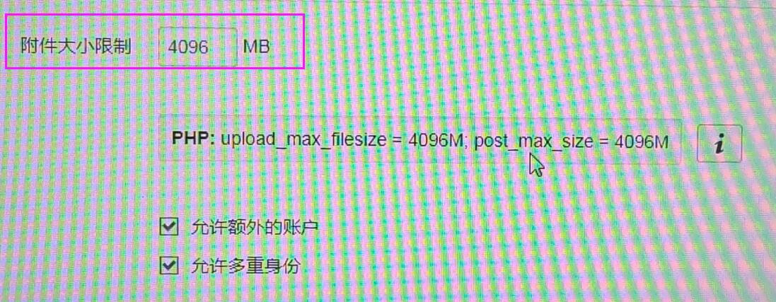2、修改附件大小显示,输入自己说需要的文件,让它打绿色的对勾即可,然后重启服务器完成!
