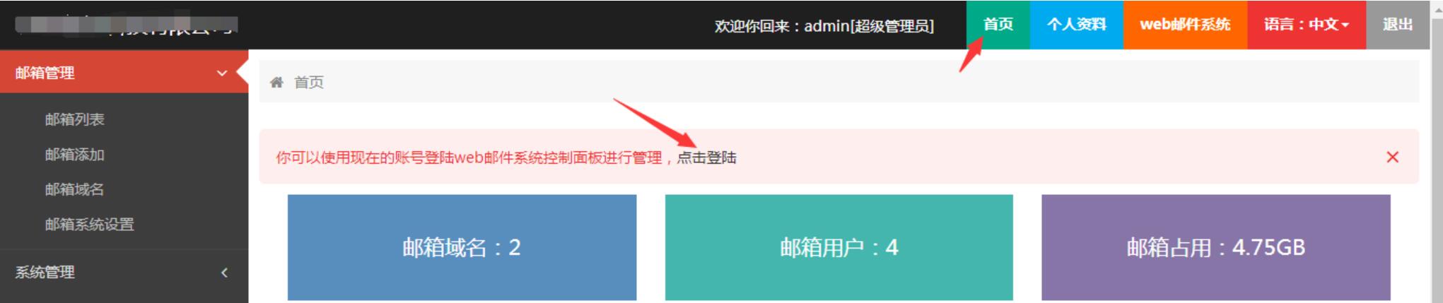 1、使用EwoMail邮件服务器admin的账号和密码登陆后台,然后点击“你可以使用现在的账号登陆web邮件系统控制面板进行管理,点击登陆”,如下图所示