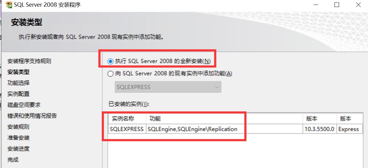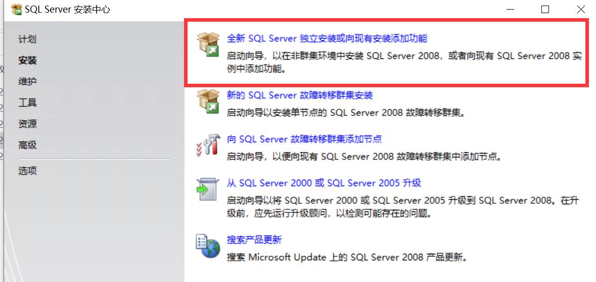 1、先下载“Microsoft® SQL Server® 2008 Management Studio Express”,然后右键管理员模式运行即可,然后继续选择“全新SQL Server独立安装或向现有安装添加功能”,如下图所示