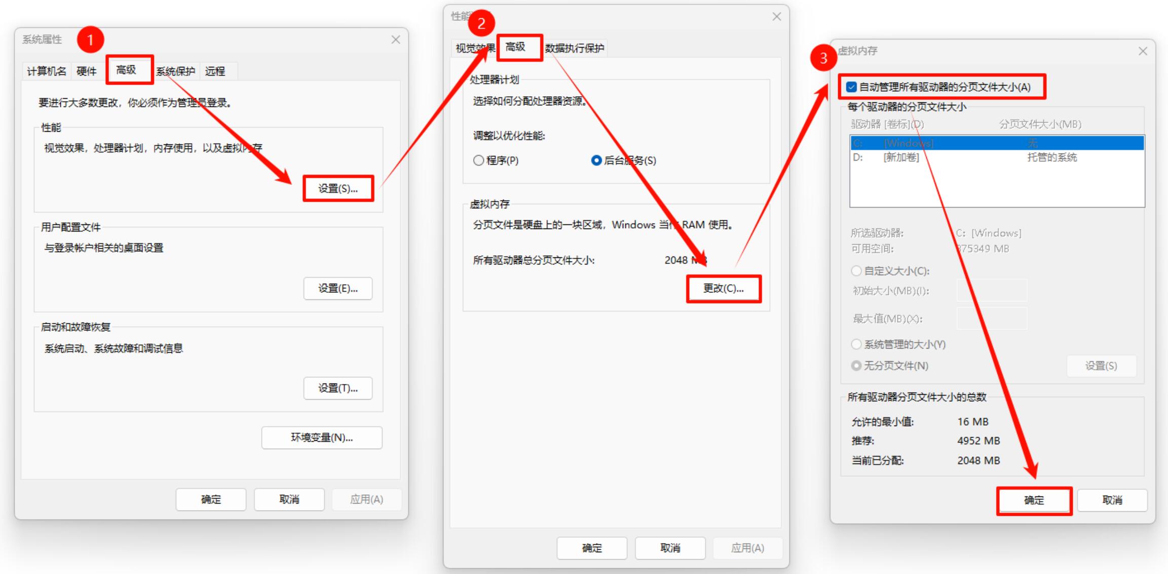 2、在“性能”区域点击“设置”,切换到“高级”选项卡,点击“虚拟内存”部分的“更改”,进入虚拟内存设置对话框,勾选“自动管理所有驱动器的分页文件大小”,点击“确定”保存设置,然后重启电脑即可,操作流程如下图所示