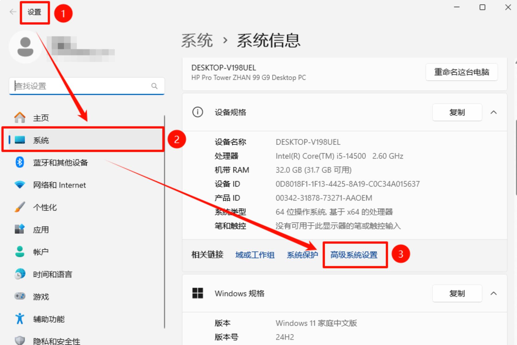 Win11:打开设置,选择“系统”,右侧找到并点击“高级系统设置”。