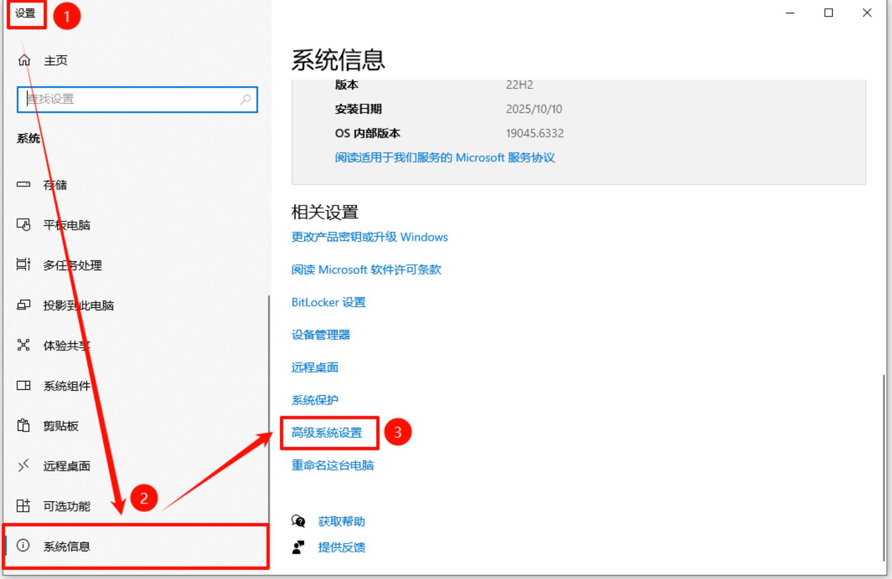 Win10:打开设置,选择“系统信息”,右侧找到并点击“高级系统设置”。;(或者直接在桌面我的电脑右键属性里也可以找到),如下图所示