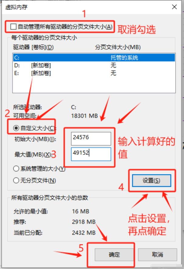 假设物理内存为16GB,建议: 初始大小:16GB × 1.5 = 24GB(24576MB) 最大值:16GB × 3 = 48GB(49152MB)