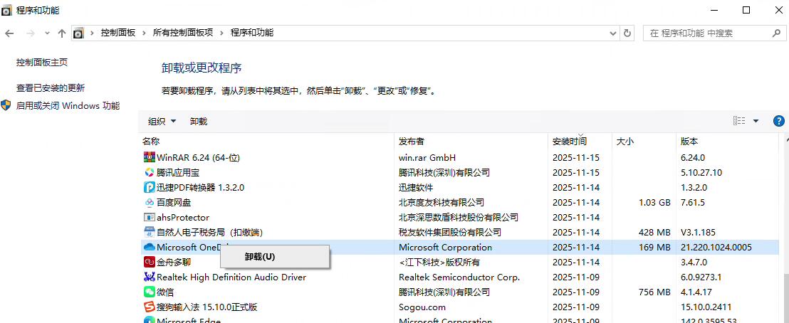 在“应用和功能”下,查找和选择“Microsoft OneDrive”,然后选择“卸载”。 如系统提示输入管理员密码或进行确认,请键入密码或提供确认,如下图所示