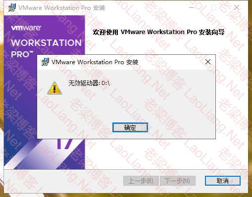 安装VMware Workstation Pro虚拟机提示“无效驱动器:D:\”的说明