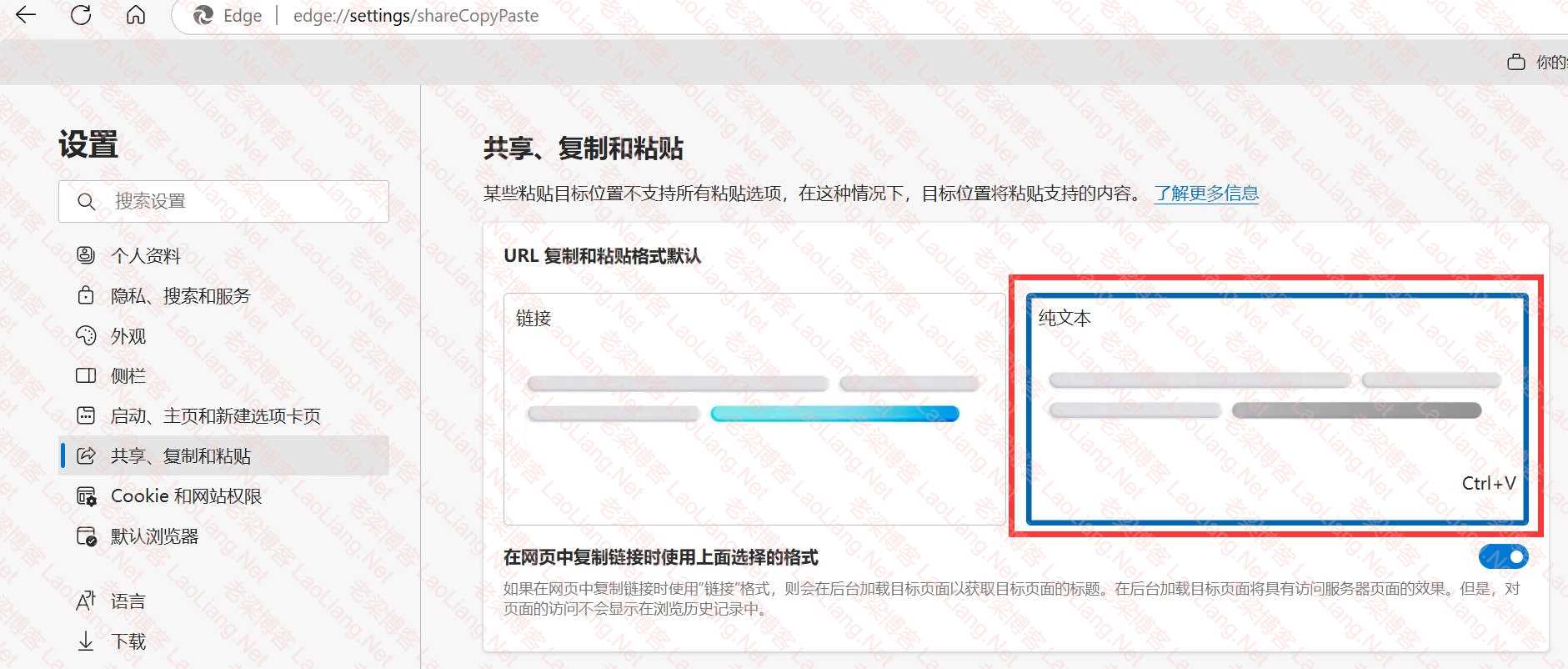 1、打开Edge浏览器的设置---- “共享、复制和粘贴”----- URL 复制粘贴的格式,将默认粘贴格式设置为 “纯文本”即可。没啥鸟用