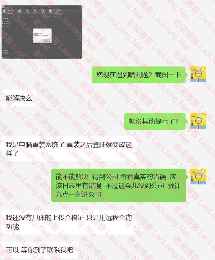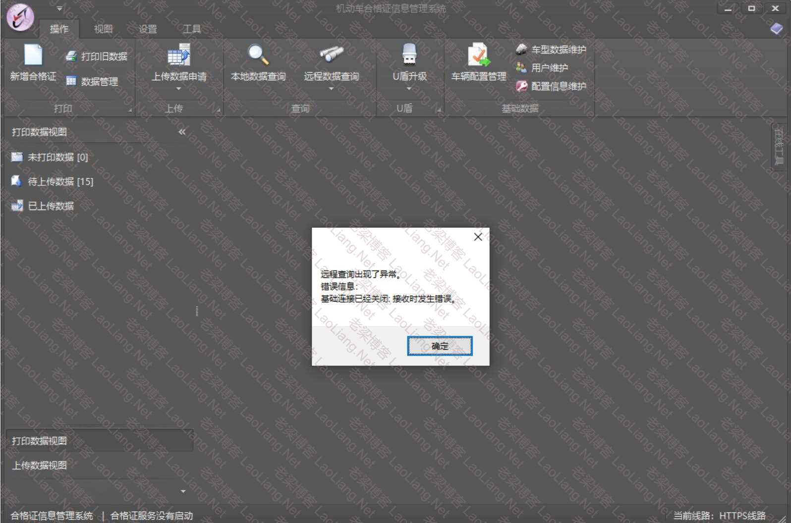 今天一早,有网友找到我说,她家的机动车合格证信息管理系统出了故障,重新做了一个系统,使用远程查询功能提示“远程查询出现了异常。错误信息:基础连接已经关闭: 接收时发生错误。”,如下图所示