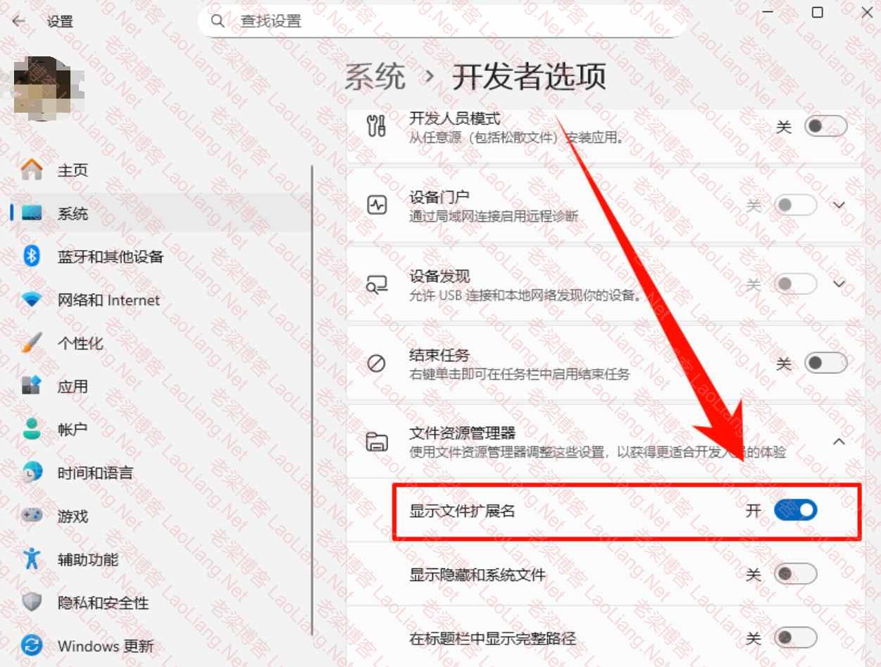 按下 Win + I 打开设置,进入「系统」→「开发者选项」,下滑找到「文件资源管理器」分组,开启「显示文件扩展名」开关。