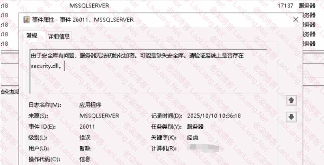 既然人家错误让查阅系统日志,咱就查看一下,在系统日志查看提示由于安全库有问题,服务器无法初始化加密。可能是缺失安全库。请验证系统上是否存在security.dll,若下图所示