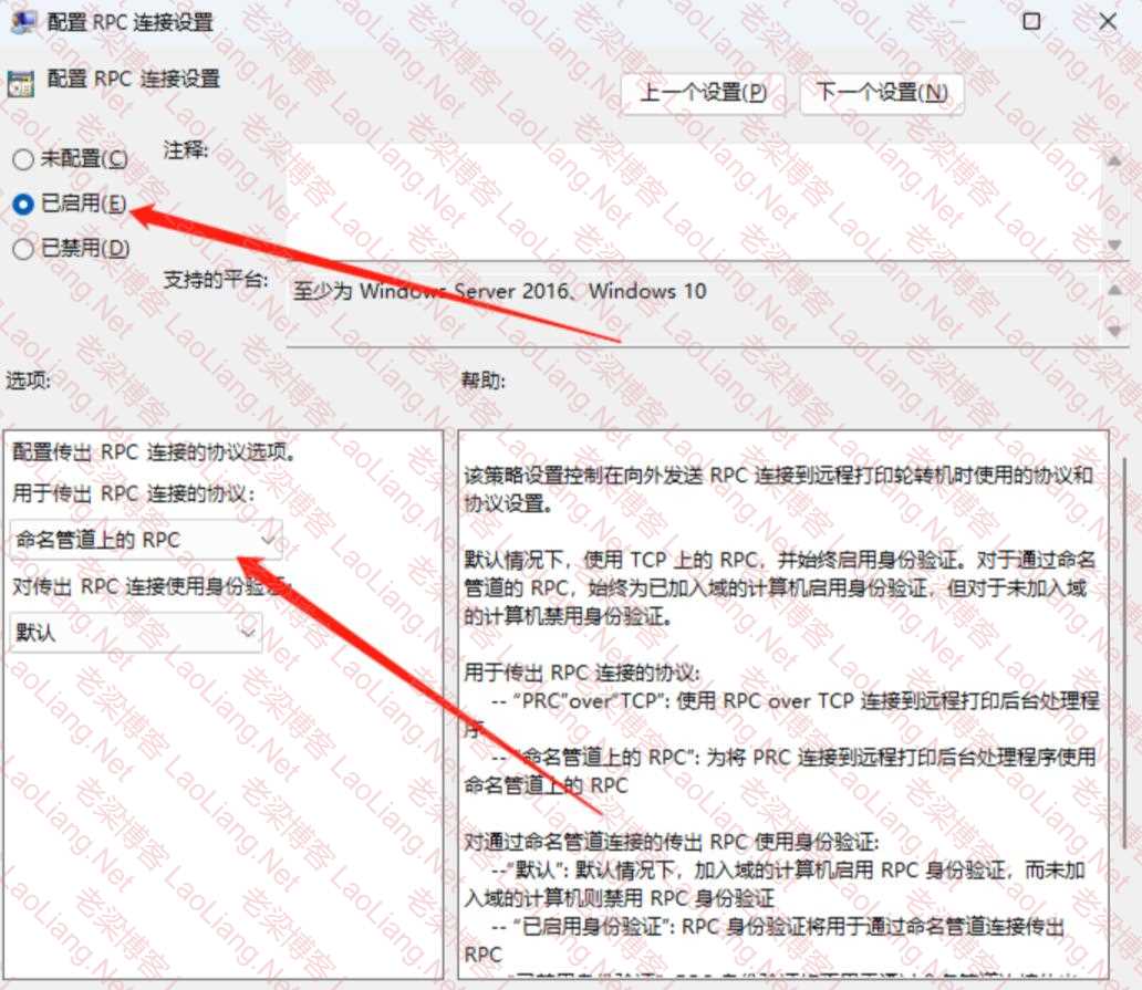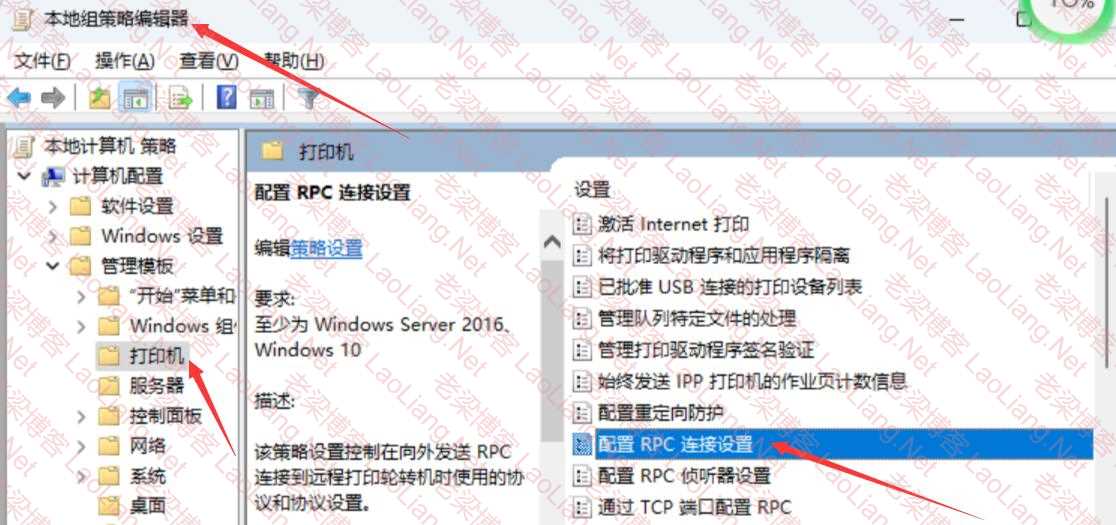 1、WIN+R--输入gpedit.msc---打开本地组策略编辑器---管理模板---打印机----配置RPC连接设置,如下图所示
