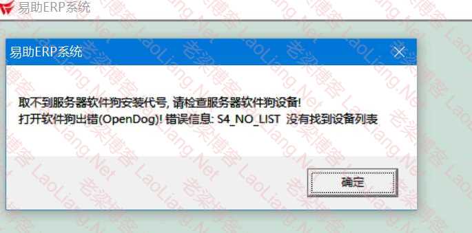 出现“取不到服务器软件狗安装代号, 请检查服务器软件狗设备!打开软件狗出错(OpenDog)! 错误信息: S4_NO_LIST 没有找到设备列表”,如下图所示