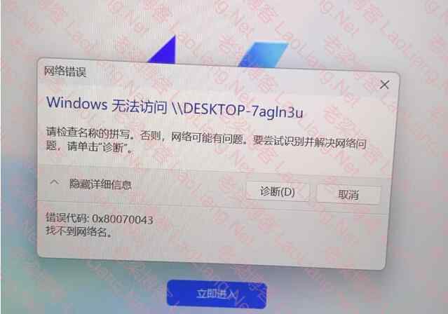 昨天有客户说她新买的电脑,想共享之前他们同事的东西,发现不能共享,提示“错误代码0x80070043找不到网络名。”,如下图所示