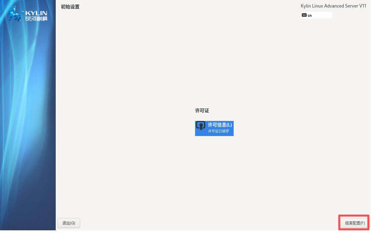 9、重启银河麒麟v11高级服务器版后,配置许可证信息并结束配置