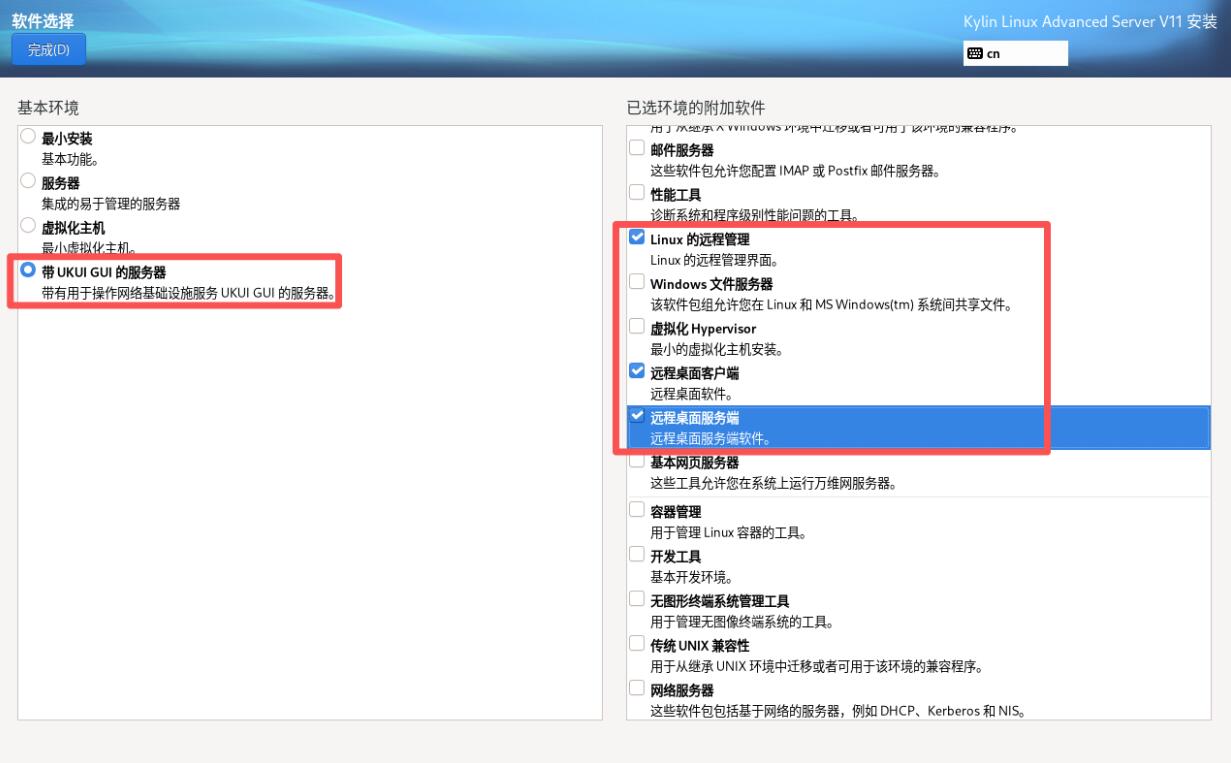 5、如需要图形化界面和远程管理工具,可在软件选择中把下面选项选中,如下图所示
