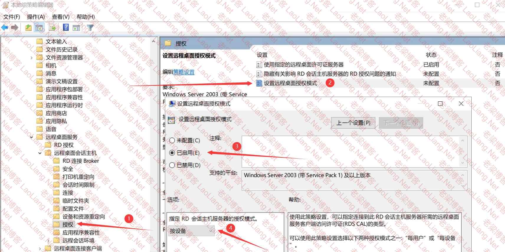 配置 使用指定的远程桌面许可证服务器 和 设置远程桌面授权模式
