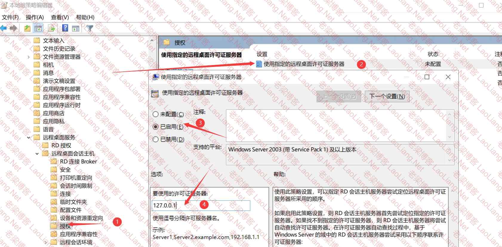 运行(win+r快捷键)输入 gpedit.msc-----计算机配置-管理模板-Windows组件-远程桌面服务-远程桌面会话主机-授权-----双击 使用指定的远程桌面许可证服务器“选择 已启用---服务器ip配置成本机ip(本机ip可以用 127.0.0.1 代替)”如下图所示