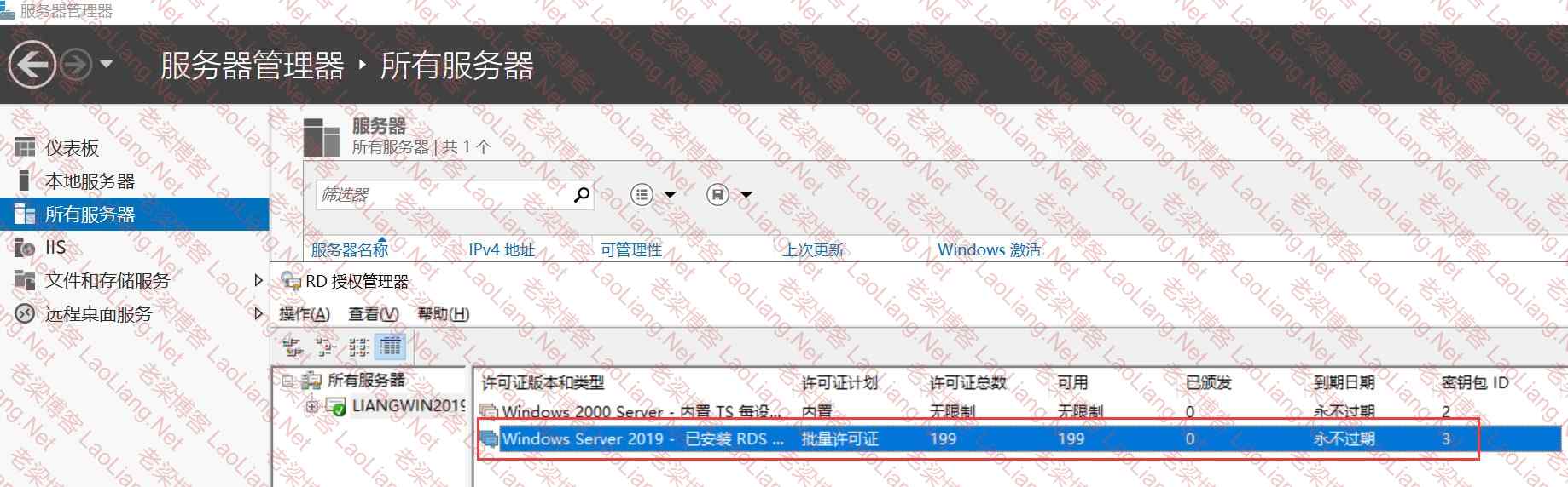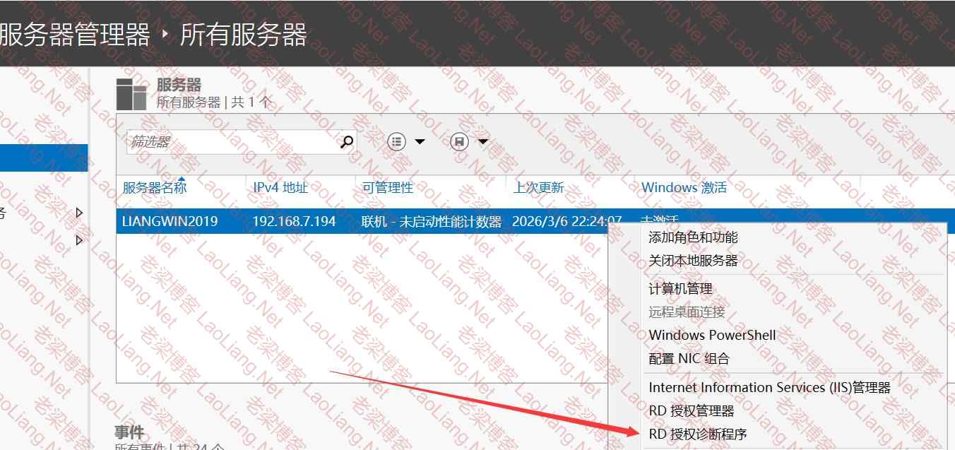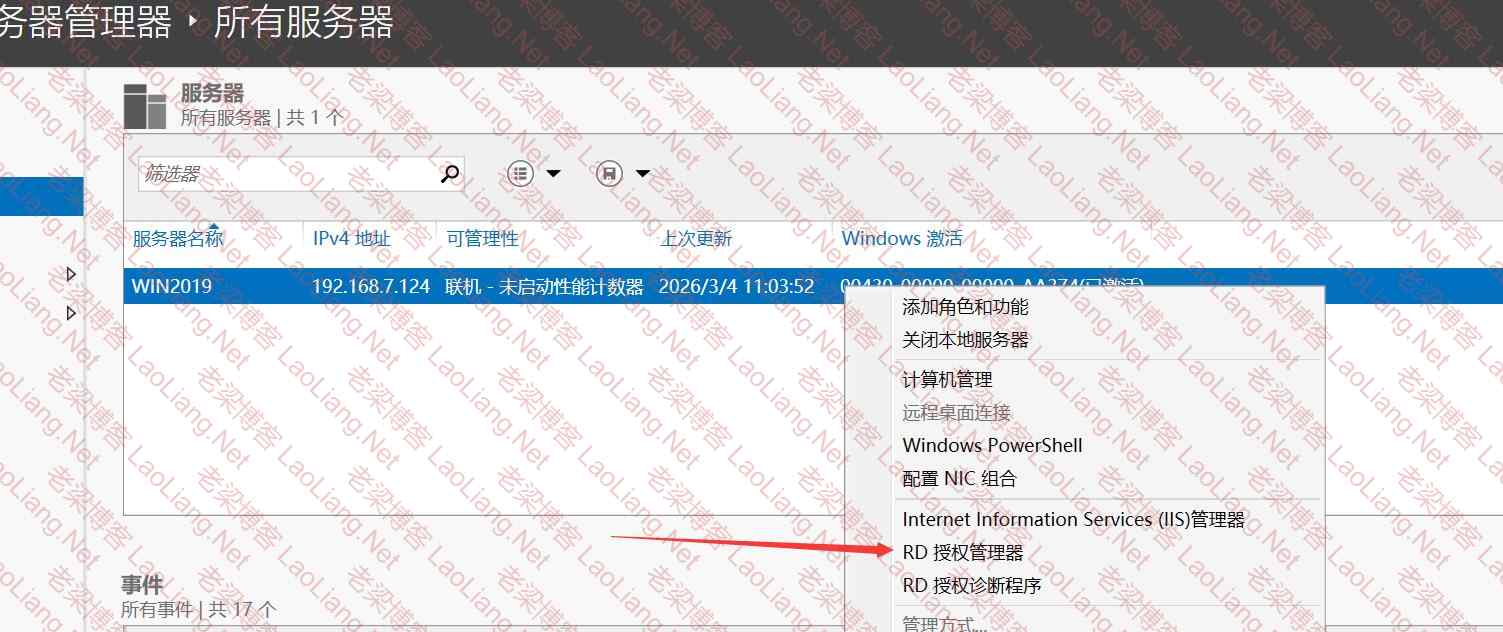直接打开服务器管理器--所有服务器--右键RD授权管理器或进入控制面板--管理工具-远程桌面会话主机(Remote Desktop Services)-远程桌面授权管理器,如下图所示