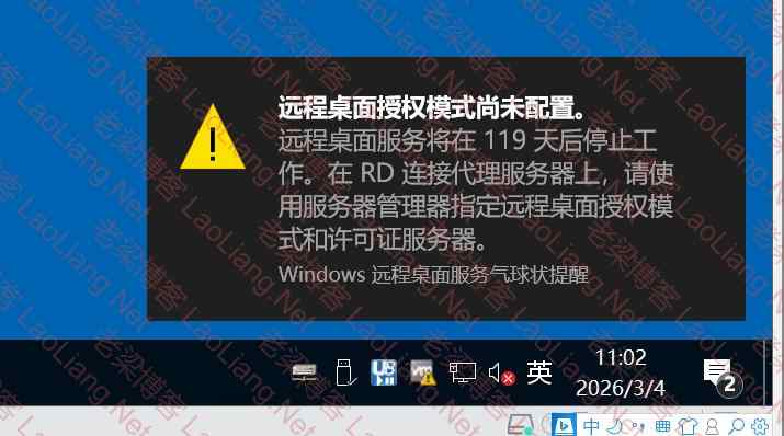 二、配置完远程桌面服务重启服务器后,会收到120天过期的提醒(如下图所示),不用理会它,继续下一步的配置即可!