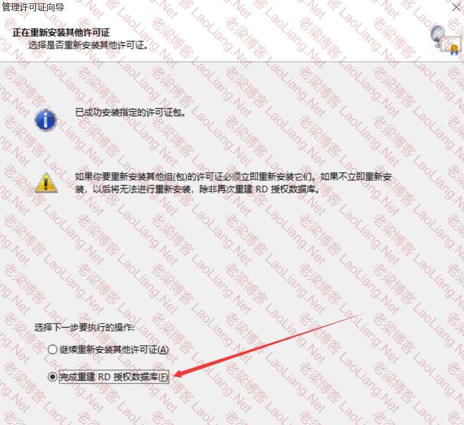 点击 所有服务器 的加号,选中许可证,右键 管理许可证,等待加载完成,选择 重建许可证服务器数据库(R),原因选择 RD 授权数据库已损坏,勾选 确认删除当前安装再此许可证服务器的许可证,选择 完全重建 RD 授权数据库,激活许可证服务器就已完成。
