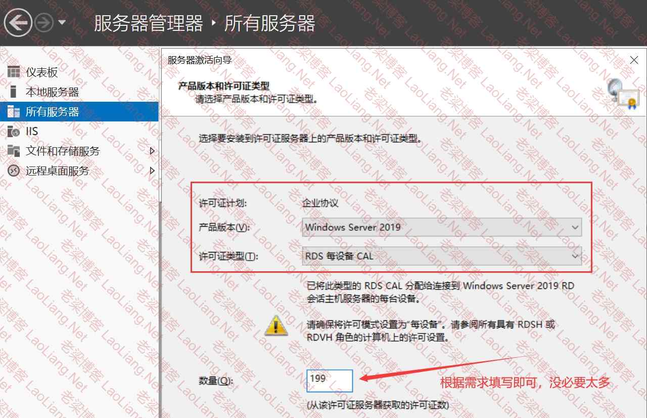 “产品版本 选择 Windows Server 2019、许可证类型 选择 RDS 每设备CAL、数量 输入要配置的数量 最大9999”