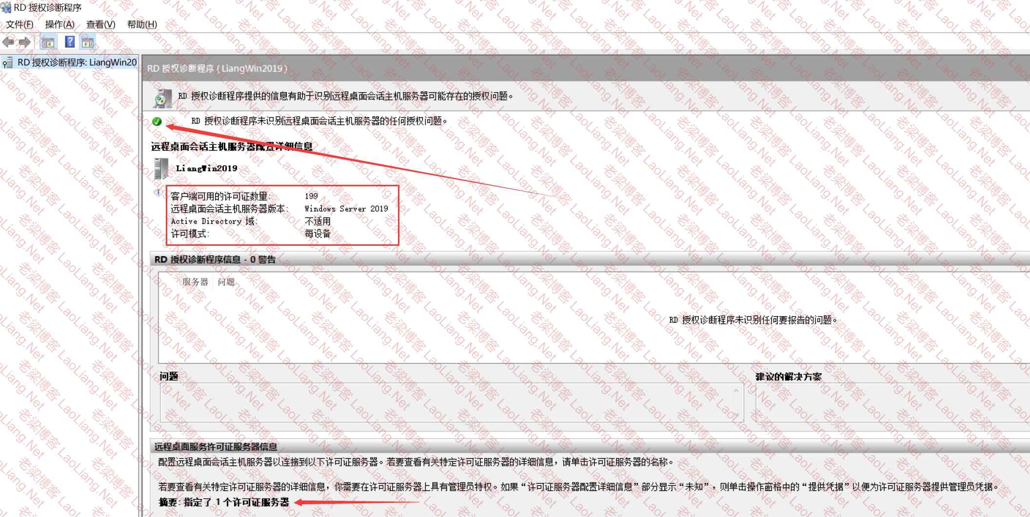 以上配置“使用指定的远程桌面许可证服务器和设置远程桌面授权模式”已完成,然后再用RD授权针对程序诊断一下,就会显示一切正常,如下图所示