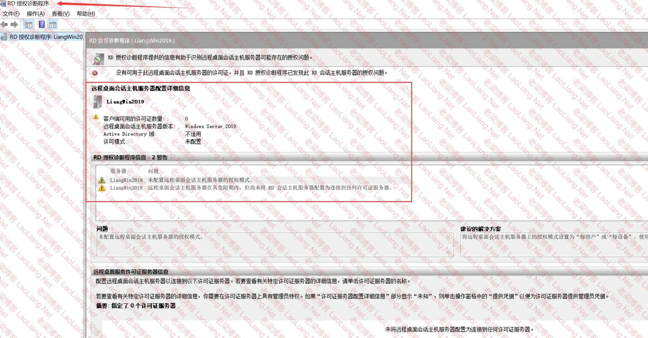 1、RD许可证管理服务器安装正常后,直接用RD授权针对程序诊断一下,会出现如下错误信息;