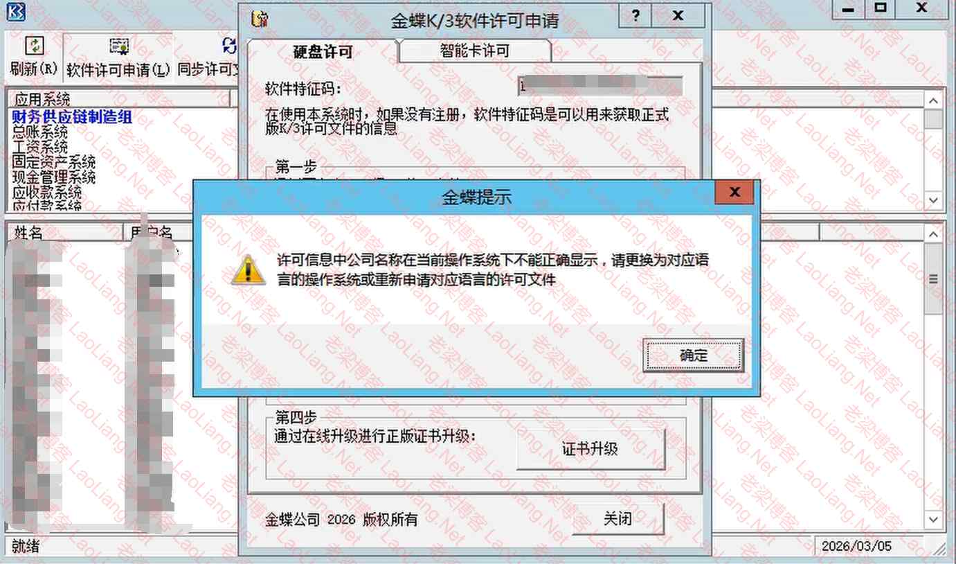 今天一早有网友找到我说他家使用的金蝶K3WISE14.2出了点故障,点啥都出现未授权,公司也没了对应的模块,备份了数据,现在想重新导入许可,可导入许可提示“许可信息中公司名称在当前操作系统下不能正确显示,请更换为对应语言的操作系统或重新申请对应语言的许可文件”,如下图所示