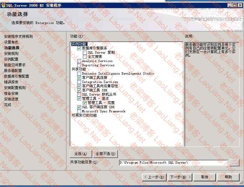 6、安装SQL Server 2008R2不需要全选,没有意义,反而给电脑造成负担,直接选择如下几个选项即可!