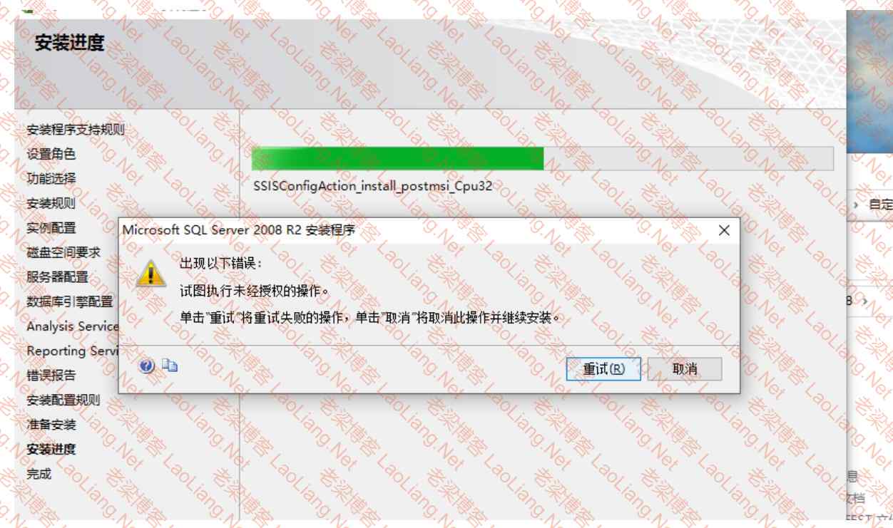 安装SQL Server 2008R2提示“SSISConfigAction_install_postmsi_Cpu32 试图执行未经授权的操作”错误的说明