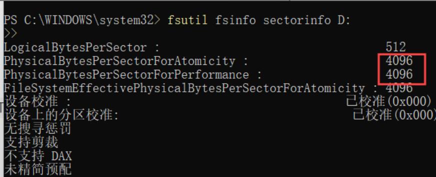 在返回的信息中,PhysicalBytesPerSectorForAtomicity这个值即为扇区大小,如此值不是512或4096,则代表SQL Server无法安装到此硬盘上哦!