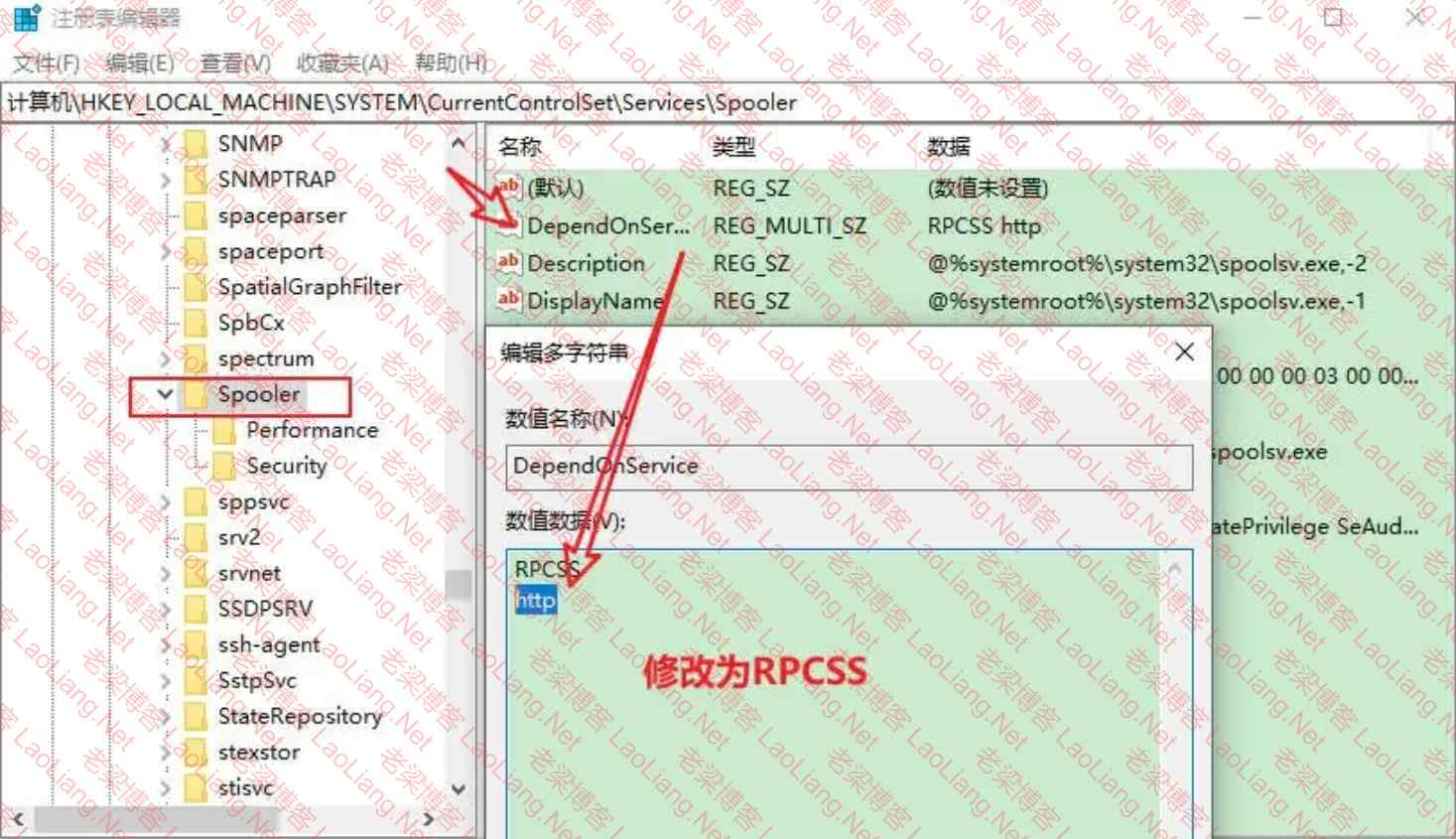键盘上的“win+R” 键----输入“regedit”打开注册表编辑器------“计算机\HKEY_LOCAL_MACHINE\SYSTEM\CurrentControlSet\Services\Spooler”找到“DependOnService”,双击修改,将”http”修改为“RPCSS”,或者仅保留“RPCSS”或其他如”http”等删除,如下图所示,点击确定后,重启打印服务或重启电脑,