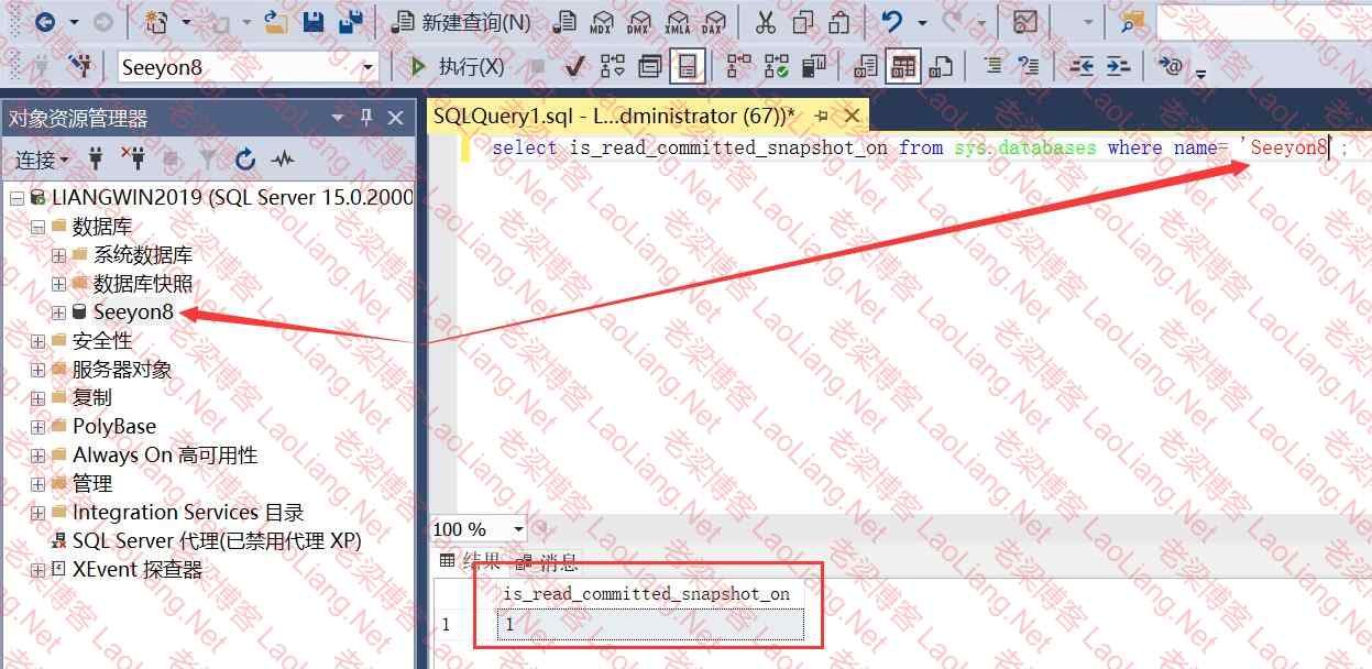 4、检查协同数据库的 READ_COMMITTED_SNAPSHOT 参数设置是否开启:查出来的值 1 为开启,0 为未开启,如下图所示