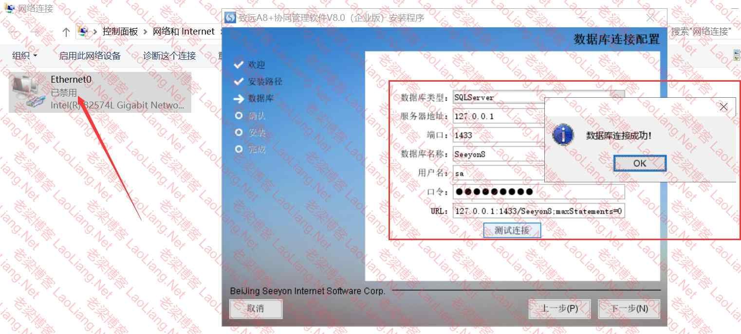 4、把你网卡禁用一下,不然会联网检测版本不是最新版本,不是最新这个无所谓,禁用网卡即可,然后设置好上面创建好的库,直接点击连接即可,正常提示“数据库连接成功!”后,下一步即可!