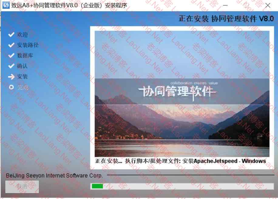 5、一切正确后,就开始进入致远A8协同管理软件8.0企业版正常安装中