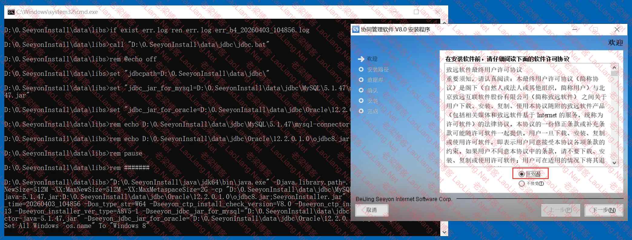 2、运行完“SeeyonA8+企业版Install.bat”会自动弹出安装界面,选择接受即可,如下图所示