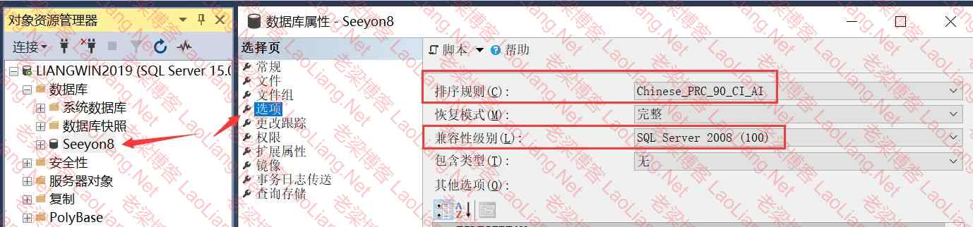 2、修改致远8.0数据库排序规则及兼容性级别,如下图所示;然后顺便设置一下sa用户的繁琐密码(需要字母+数字8位或以上);