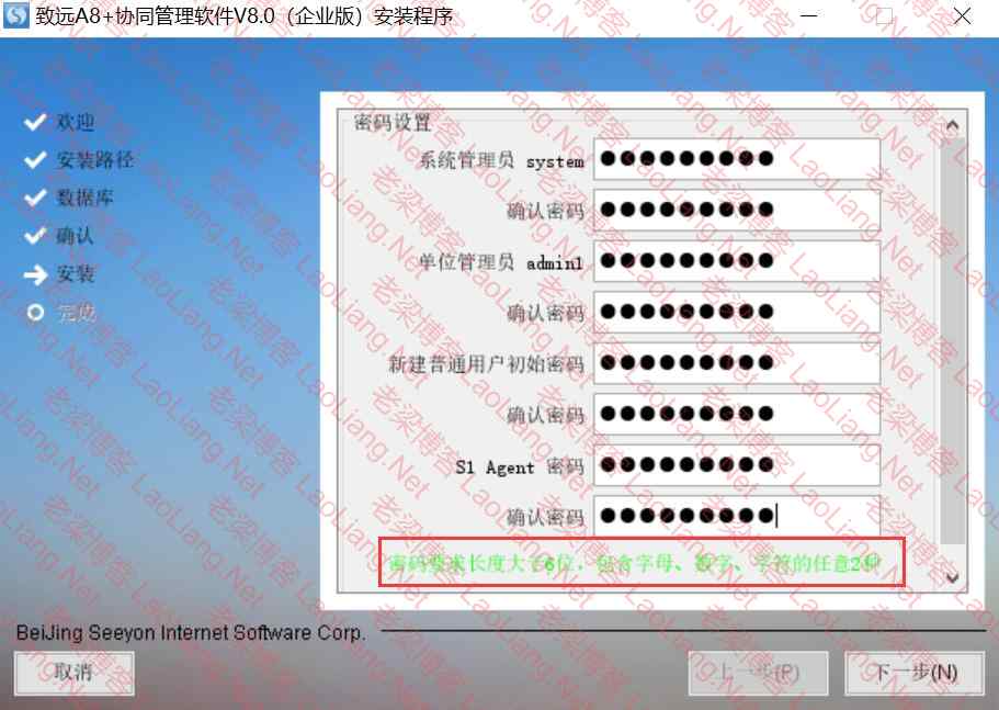 6、设置一下相关用户名及密码,一定要记住设置的这些信息哦~~(注意红色框中:密码要求长度大于6位,包含字母、数字、字符的任意2位)