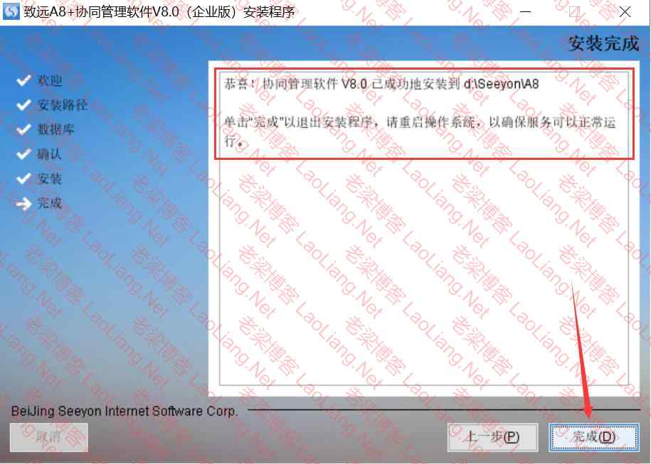 恭喜!协同管理软件 V8.0 已成功地安装到 d:\Seeyon\A8