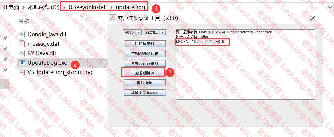 进入安装文件目录(不是安装好的目录)SeeyonInstall\updateDog\UpdateDog、双击打开;复制MAC地址生成授权即可;授权文件为两个(A8V5.seeyonkey为A8授权、iWebBarcode.lic为二维码授权)授权放在 X:\Seeyon\A8\base\license目录下即可,没有license目录可以手动创建;