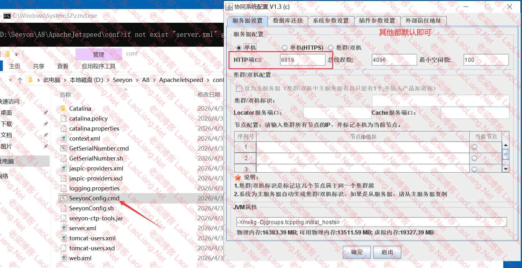 1、设置端口或者检查端口以及你数据库链接或其他参数;X:\Seeyon\A8\ApacheJetspeed\conf\SeeyonConfig.cmd 设置你的端口