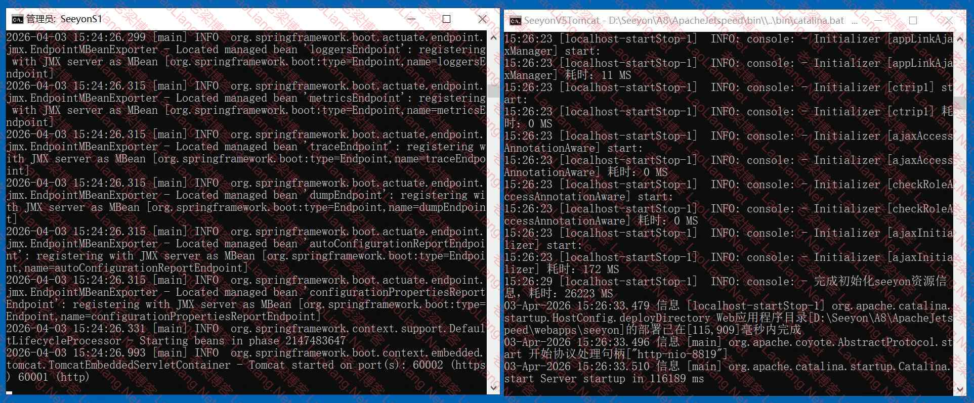 03-Apr-2026 15:26:33.479 信息 [localhost-startStop-1] org.apache.catalina.startup.HostConfig.deployDirectory Web应用程序目录[D:\Seeyon\A8\ApacheJetspeed\webapps\seeyon]的部署已在[115,909]毫 秒内完成