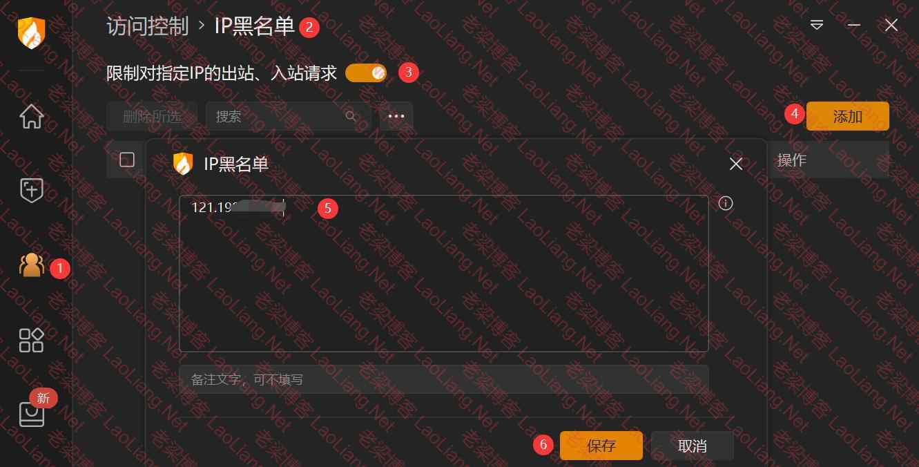 2、火绒安全软件安装成功,点击左边①访问控制---开启---IP黑名单即可(注意③号拉条),在④号处添加,添加完点确定即可,如下图所示