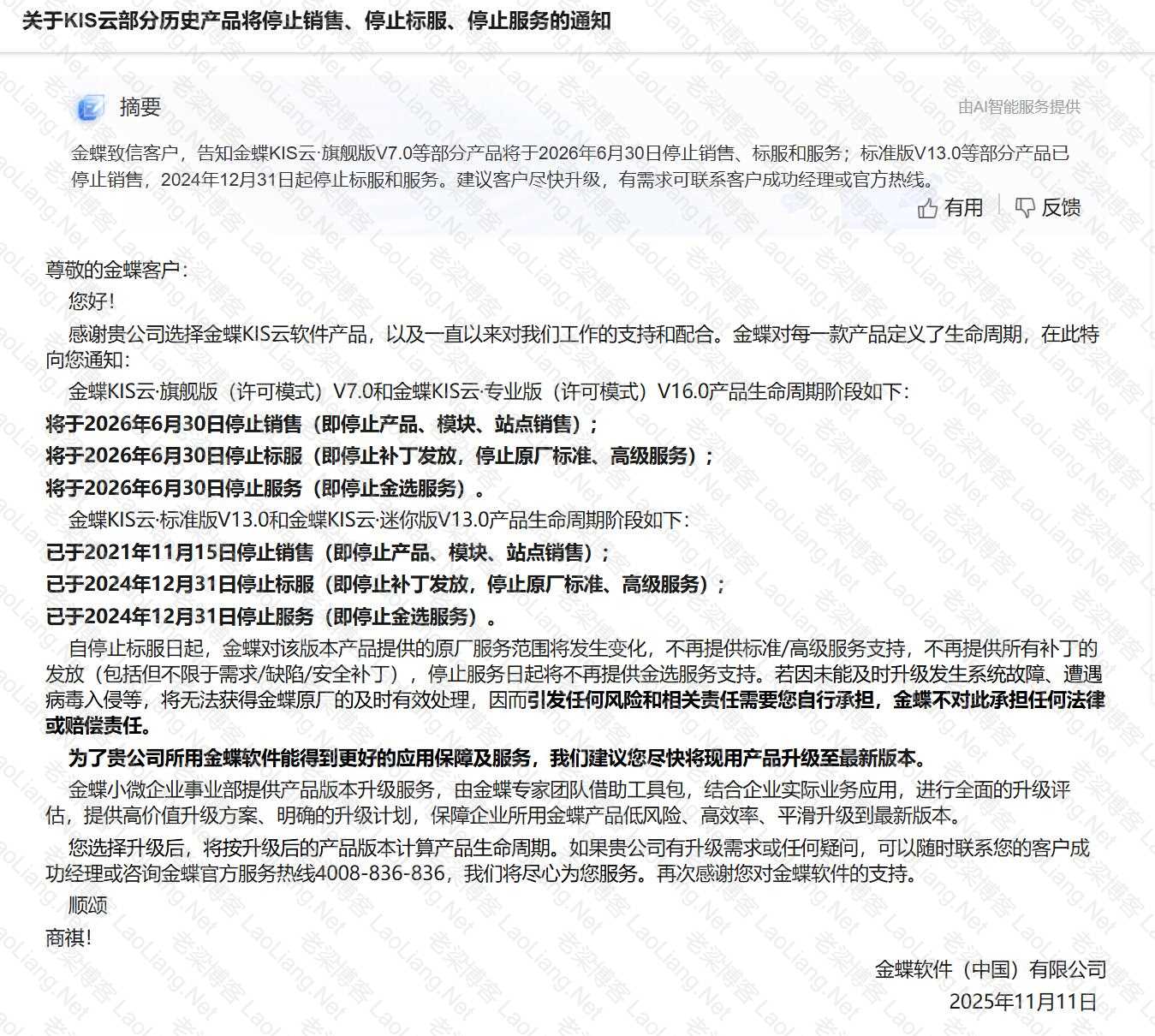2025年11月11日金蝶官方发布“关于KIS云部分历史产品将停止销售、停止标服、停止服务的通知 ”公告