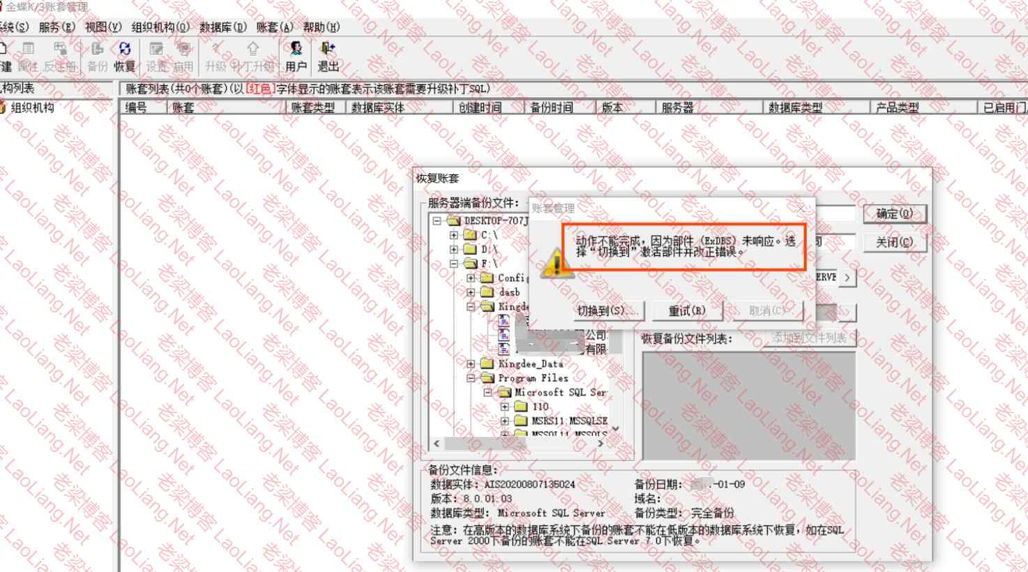 老梁(蛤蟆哥)运维技术启动SQL Server 2008R2时提示“Windows不能在本地计算机启动SQL Server (MSSQLSERVER) 特定错误代码3414”的说明 前两天有网友发了我一张图,说他家的金蝶kis专业版14.0用的SQL Server ...